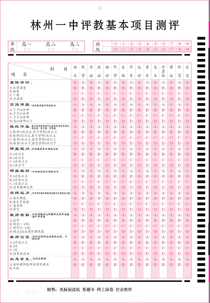 品科光標(biāo)閱讀機(jī)(閱卷機(jī))的使用范圍:主要應(yīng)用于國(guó)內(nèi)外考試評(píng)卷、考試報(bào)名、志愿統(tǒng)計(jì)、各行各業(yè)的干部測(cè)評(píng)、考核、選舉、數(shù)據(jù)采集。現(xiàn)在品科的光標(biāo)閱讀機(jī)產(chǎn)品已經(jīng)在全國(guó)30幾個(gè)省市的重點(diǎn)初中、重點(diǎn)高中、重點(diǎn)大學(xué)使用開(kāi)了。給廣大用戶提供了方便快捷,售后服務(wù)周到的印象。