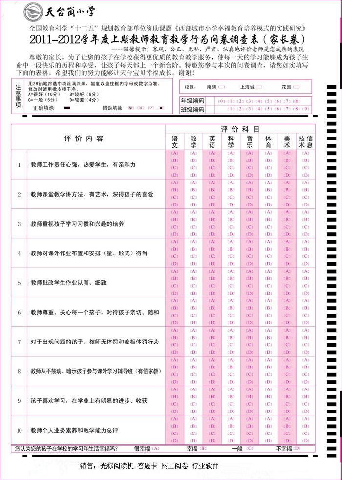 本公司采用的雙發一收光柵式光電傳感器,并采用DSP處理器,CPLD和高頻數字電路抗干擾技術,實現了高速采樣控制和智能模糊識別算法,大大改善了涂點識別的準確性和智能化程度,徹底解決了以往閱讀機因電路造成的漏、冒點問題。對于不太規范的,橡皮擦不干凈的涂點都有令人滿意的智能識別效果并增加了系統的穩定性。